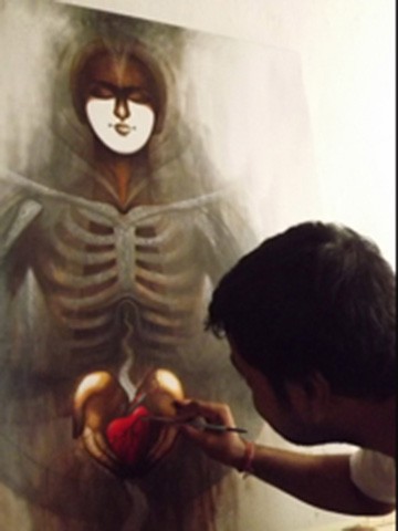 Arabinda Samanta, born in 1974 at Kolkata, received his formal education in art from the Government College of Art & Craft, Calcutta University. Inspired by Indian mythology, most of his paintings are a celebration of love and togetherness. The exhilaration, commitment and sanctity of eternity and divinity in the company of nature and rustic monumental arenas find a strategic place in Samanta’s art. The artist is overwhelmed by his own innate devotion. The depiction of passionate scenes of gods and goddesses carved in stone at Konark, Khajuraho and other religious monuments across India has inspired him to paint a series on the theme. The artist has had several group and solo exhibitions in India and his works have been acquired for many private and corporate collections. Samanta is based in Mumbai and works from his studio in the city.