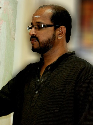 Born in 1965 in rural Kerala, Sadaanandan PK received his Master’s in Painting and also learnt traditional mural painting under the gurukula system. His art-scape features icons and narratives inspired by mythology, encased within the natural elements and organic world. Using traditional techniques and colours derived from natural materials, he brings heritage in an interface with modernity. Marked for their vibrant colours and luminosity, the compositions, be they figurative or landscape, on canvas or on walls, display his acumen in execution. The artist has also done illustrations and cartoons for books and magazines besides working on restoration of old murals. He has participated in over 50 exhibitions held at Delhi, Chennai, Hyderabad, Mumbai, Pune, Trichur, Trivandrum, Bangalore and overseas in Spain and New York. His works are also held in collections at Apollo Hospital, Sun Group, Kerala State Museum and with private individuals across India, the US, Thailand, China, Japan and UK amongst others. His murals adorn public and private spaces and hotels in various Indian metro cities besides temples and churches in southern region. Winner of the AT Abu Memorial Award for his mural work and All Kerala Creative Artists Association’s awards for his cartoons, Sadaanandan’s paintings have received much critical acclaim. He lives and works in Thrissur, Kerala.